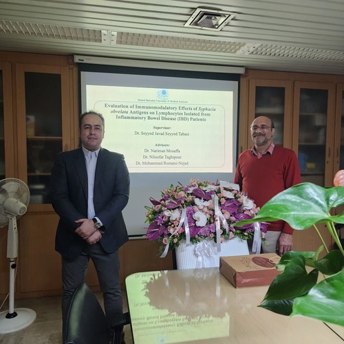 جلسه دفاع از رساله دکترای تخصصی آقای عباس امین دانشجوی مقطع دکترای تخصصی رشته انگل شناسی پزشکی، روز دوشنبه 15 دی ماه در کتابخانه گروه انگل شناسی دانشکده پزشکی با عنوان "ارزیابی پاسخ های تعدیل کننده ایمنی آنتی ژن های Syphacia obvelata بر لنفوسیت های خون محیطی افراد مبتلا به IBD"برگزار شد.